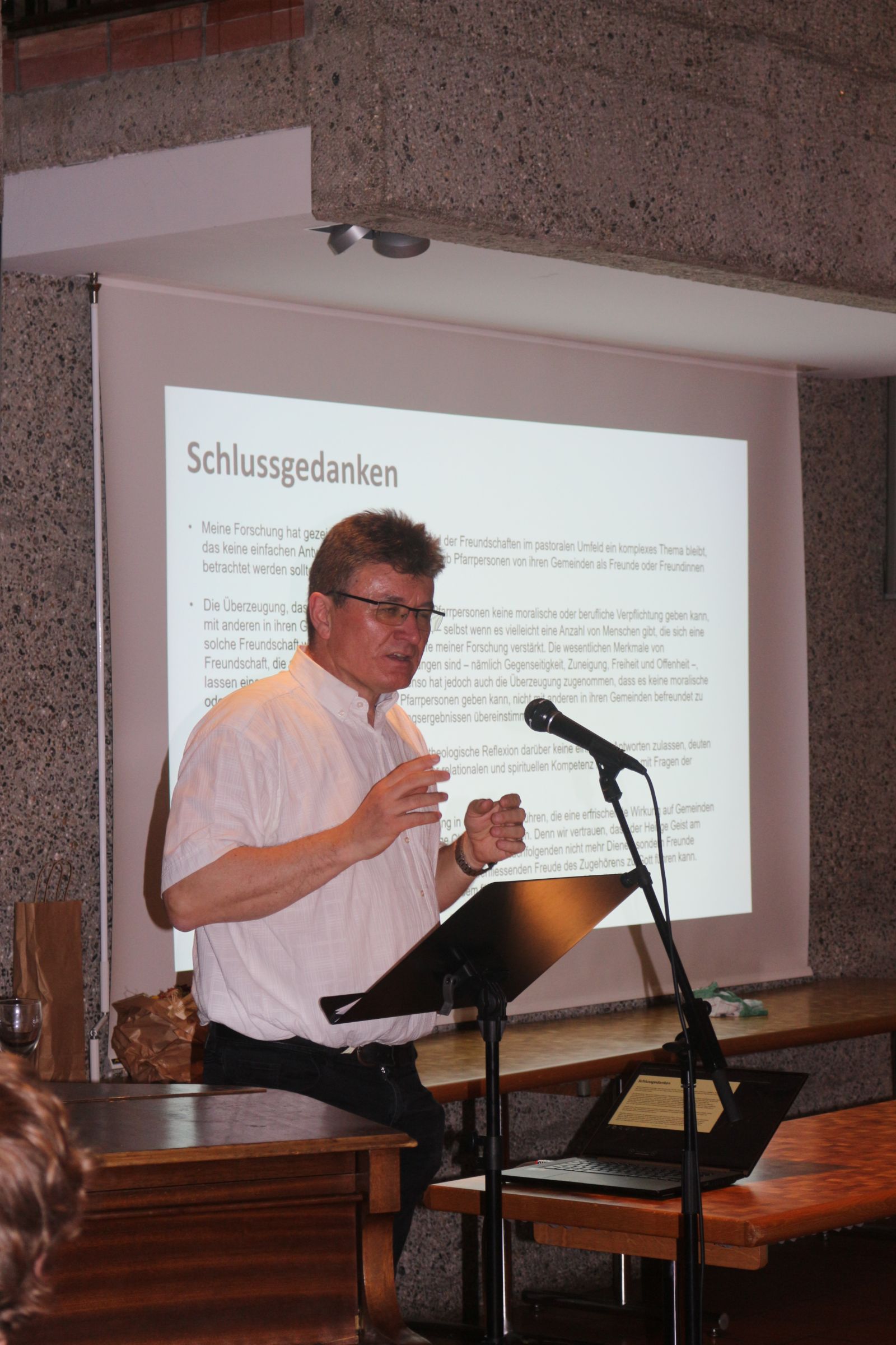 Nach dem eröffnenden Apero, der Gelegenheit zum Kennenlernen und Wiedersehen gab, durften sich alle Gäste bei einem feinen Abendessen stärken. Das Dessert ging dann gleitend in den Vortrag von Pfr. Dr. Dan Holder über, in dem dieser über verschiedene Beziehungsformen im Pfarrberuf reflektierte und tiefer in die Details seiner qualitativ ausgerichteten Untersuchung einging. Eine differenzierte und tiefgründige Auseinandersetzung mit den Unterschieden zwischen "Freundschaft" und "Freundlichkeit " im pastoralen Kontext!